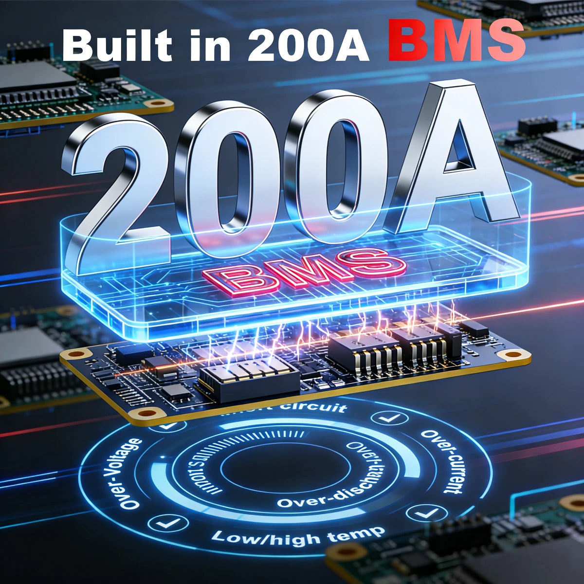 - 100A Built-in BMS – Provides protection against overcharge, over-discharge, overcurrent, overheating, short circuit, and low-temperature cutoff.
